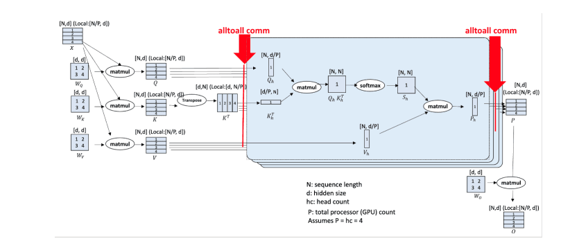 Figure 2 shows the core design of DeepSpeed-Ulysses paper. As with the known transformer architecture, the design consists of input sequences NNN partitioned across PPP available devices. Each local N/PN/PN/P partition is projected into queries (Q), keys (K), and values (V) embeddings. Next, the QKV embeddings are gathered into global QKV through highly optimized all-to-all collectives between the participating compute devices. Following the all-to-all collective is the attention computation per head, expressed in the form: