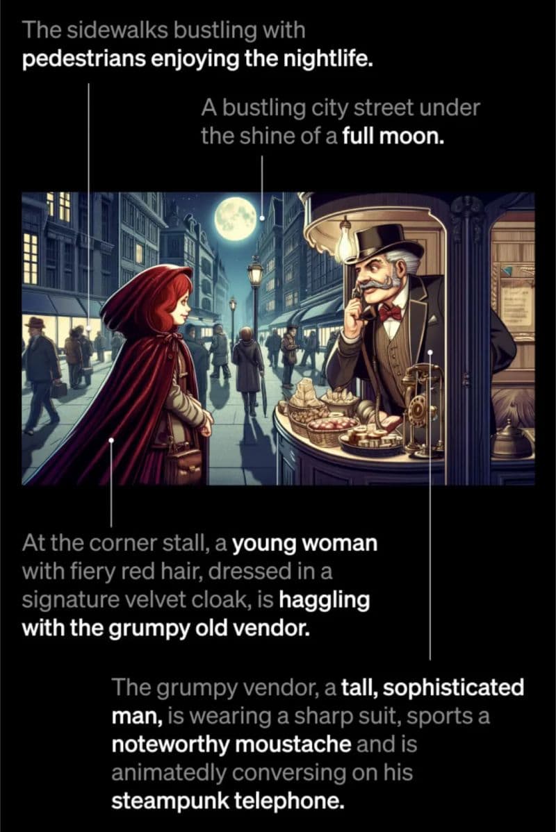 Previous models like Midjourney and Stable Diffusion excelled in generating high-quality images of solitary characters and objects but struggled with scenes involving specific relationships and interactions between multiple objects. DALL-E 3 has made significant strides in generating images that represent intricate scenes with multiple objects maintaining specific spatial and interactive relationships, a challenge that predecessors like Midjourney and Stable Diffusion found formidable. For instance: