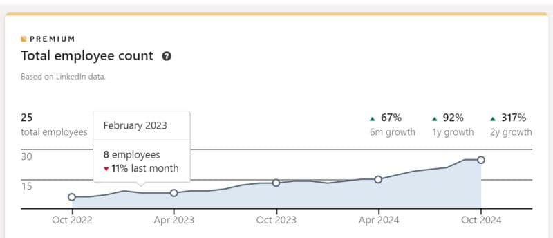 It's been an exciting journey watching our team grow, and we're just getting started! 🚀 In February 2023, we were a small but mighty group of 8. Fast forward to today, and we're 25 strong – a 317% increase in just 2 years! At this rate, we could reach 50 amazing team members by mid-2025, and we couldn’t be more excited about what’s ahead.