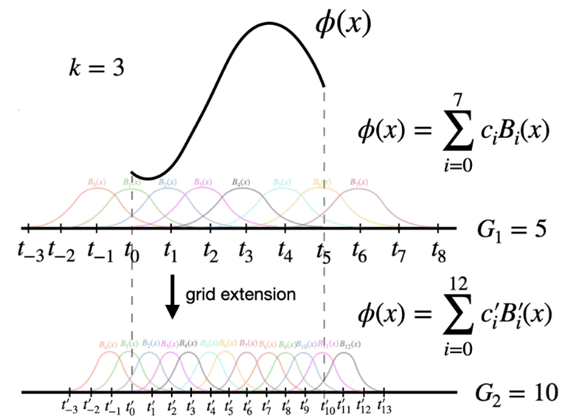 Now that you understand that control points essentially form the shape of the curve, and that at the end of the day we need to learn some continuous function, can you guess what the learnable parameters of KAN are? Well of course the c(i)'s! The basis functions on the other hand are ugly looking recursive functions, and you can check it out here. Furthermore, as you can guess higher the number of âgrid pointsâ (G given in the above graph), better the approximation of the underlying curve.