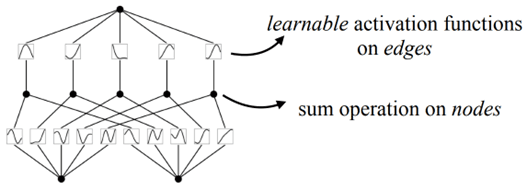The original equation described in the first section can be depicted as a 2-layer KAN as shown above. The nodes are where the summation operation takes place, and the learnable activations ɸ are on the edges, in contrast to MLPs where the edges have learnable weights instead, and the activation is fixed and is performed on the nodes.