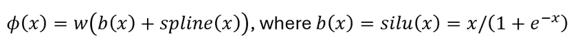 The authors define ɸ(x) as given above, and spline(x) is parametrized as a linear combination of B-splines as we discussed before this section. They include the w as a factor to better control the overall magnitude of this activation function. They also update the grid (size G) on the fly according to its input activations, to address the issue that splines are defined on bounded regions (for example t(0) to t(5) in the previous sections spline curve diagram) but activation values can evolve out of the fixed region during training.