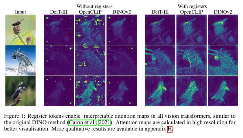 Introducing additional "register tokens" into the architecture. These tokens aren't derived from the image data but are included to accumulate and refine essential features across transformer layers. By balancing the attention mechanism, these registers help mitigate the impact of high-norm tokens and enhance the overall focus and efficacy of the model.