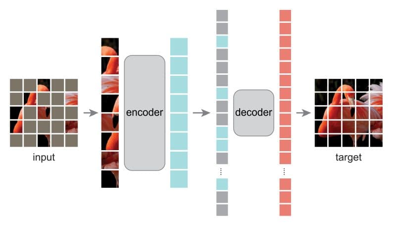 CL is a widely-used self-supervised learning method that works by pulling the embeddings (representations in a high-dimensional space) of various transformations (variations, such as a rotated version) of the same image closer together, and pushing those from images of different classes apart. MIM, on the other hand, has more recently risen to prominence, particularly with ViTs. MIM functions by masking random patches in the input image and subsequently reconstructing the missing pixels, as shown in the image below.